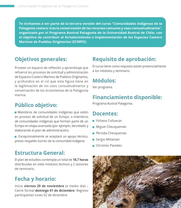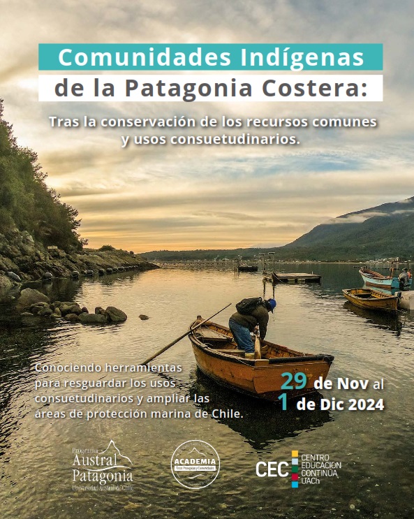 El Programa Austral Patagonia junto a la Academia de Áreas protegidas y comunidades, y el Centro de Educación Continua de la Universidad Austral de Chile invitan al programa de formación “Comunidades indígenas de la Patagonia costera: tras la conservación de los recursos comunes y usos consuetudinarios» con objeto de contribuir al fortalecimiento e implementación de los Espacios Costeros Marinos de los Pueblos Originarios (Ecmpo).