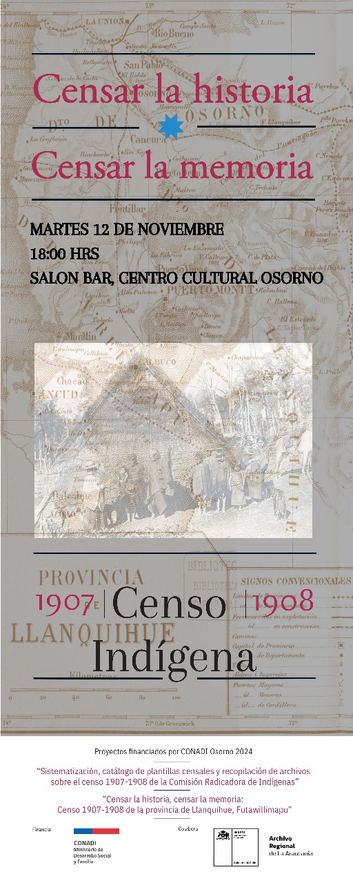 El día martes 12 de noviembre, a las 18 horas, en el Centro Cultural de Osorno, ubicado Matta #556, se realizará la presentación de «Censar la Historia-Censar la Memoria», actividad abierta y gratuita, que busca dar cuenta de los resultados de la investigación sobre el primer censo realizado por los capuchinos hacia el Pueblo Mapuche Williche entre los años 1907-1908.