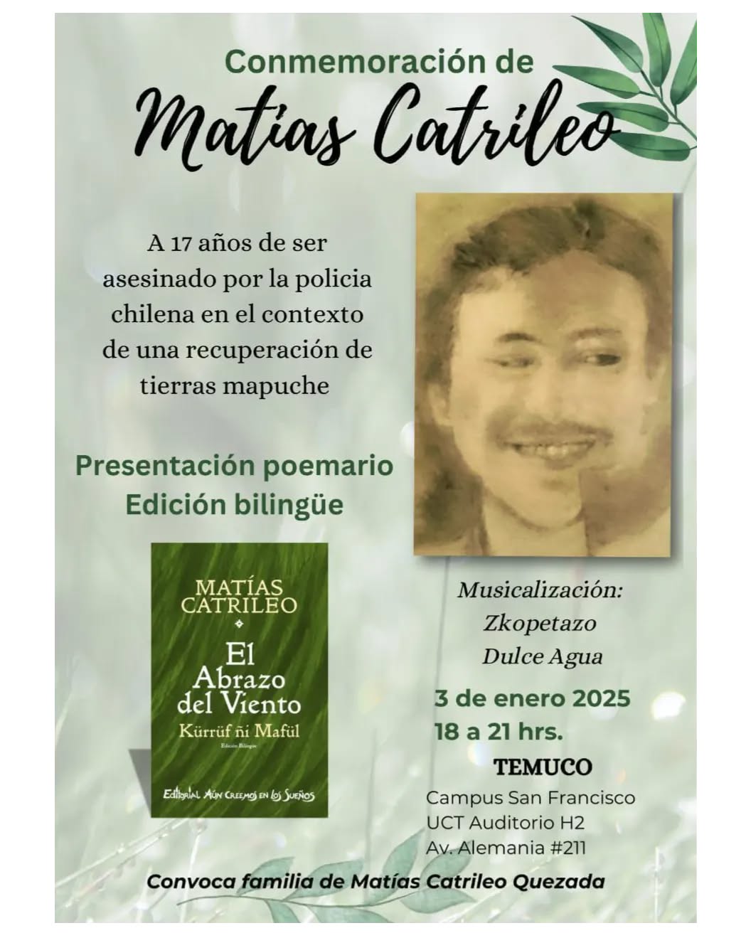 En Temuko, invitan a la jornada en conmemoración de Matías Catrileo en la que se presentará el poemario de Matías, edición bilingüe, «El Abrazo del Viento: Kürruf ñi Mafül»(Editorial Aún creemos en los sueños).