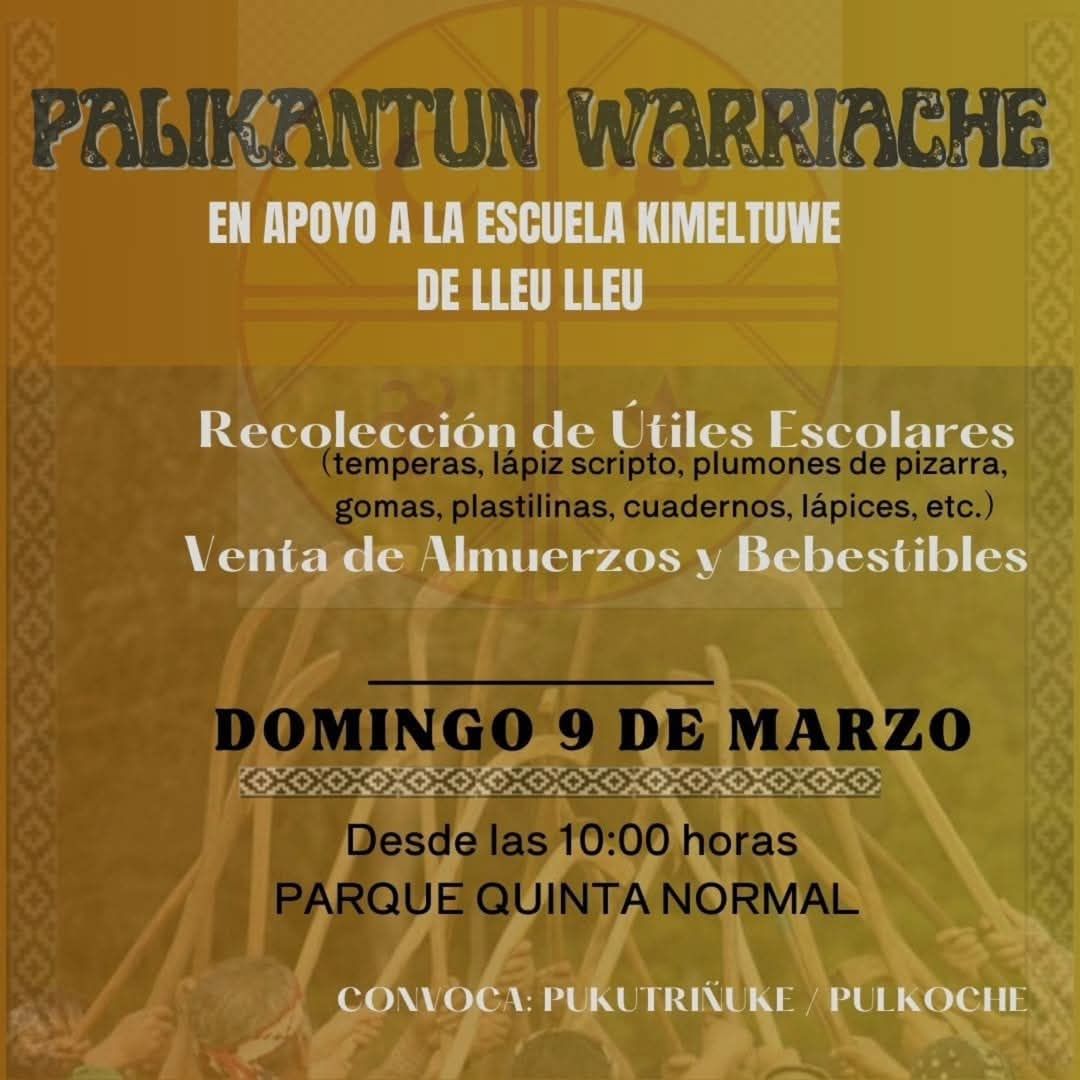 Con la finalidad de apoyar a la Escuela Kimeltuwe de Lleu Lleu, en el Parque Quinta Normal de Santiago, se realizará una jornada de recolección de útiles escolares el día domingo 9 de marzo, desde las 10 horas.