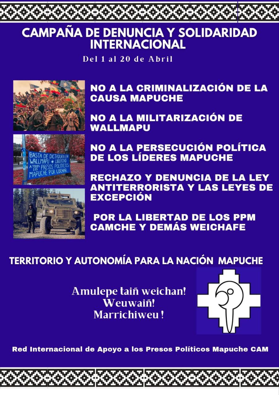 Desde la Red Internacional de Apoyo a los Presos Políticos Mapuche CAM iniciamos una Campaña de Solidaridad Internacional para visibilizar y denunciar la estigmatización, criminalización y persecución que vive el pueblo mapuche en general y el movimiento Mapuche autonomista en particular por el Estado de Chile y su actual gobierno pseudoprogresista, que en la actualidad se ha vuelto títere de los intereses de las empresas ocupantes del territorio ancestral.