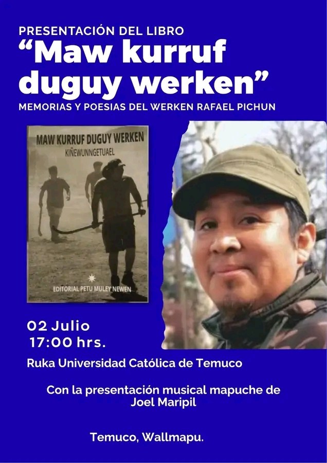 El día miércoles 2 de Julio desde las 17.00 horas, en la Ruka de la Universidad Católica de Temuco Campus San Juan Pablo II ubicada en Rudecindo Ortega 2950, Temuco se realizará el lanzamiento del libro: «MAW KURRUF DUGUY WERKEN» del werken Rafael Pichun Collonao.