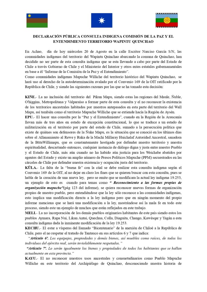 En Achao, día de hoy miércoles 20 de Agosto en la calle Escritor Narciso García S/N, las comunidades indígenas del territorio del Wapintu Quinchao abarcando la comuna de Quinchao, han decidido no ser parte de esta consulta indigena que se esta llevando a cabo por parte del Estado de Chile a través Gobierno de Chile y el Ministerio del Interior y otros entes estatales gubernamentales en base a él “Informe de la Comisión de la Paz y el Entendimiento”.