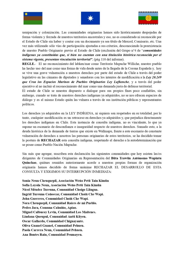 Sin más que agregar, suscriben esta declaración las siguientes comunidades que hoy asisten las/os dirigentes de Comunidades Originarias en Representación del Büta Trawün Autónomo Wapintu Quinchao, quiénes reunidos anteriormente acorde a nuestras propias formas de organización originaria hemos decidido de forma unánime RECHAZAR EL DESARROLLO DE ESTA CONSULTA Y EXIGIMOS SU INTERRUPCIÓN INMEDIATA: