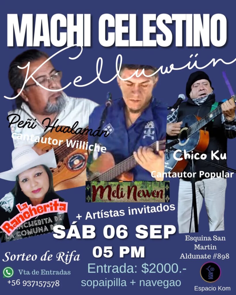 Este sábado 06 de septiembre se realizará “Encuentro Kelluwün por el Machi”, será en formato peña a partir de las 17:00 hrs. en el lugar Espacio Kom (Aldunate #898 /esquina San Martín). Actividad en beneficio, para ir en ayuda directa al machi, es abierta al público en general e invita compartir música, cultura y tradición mapuche.