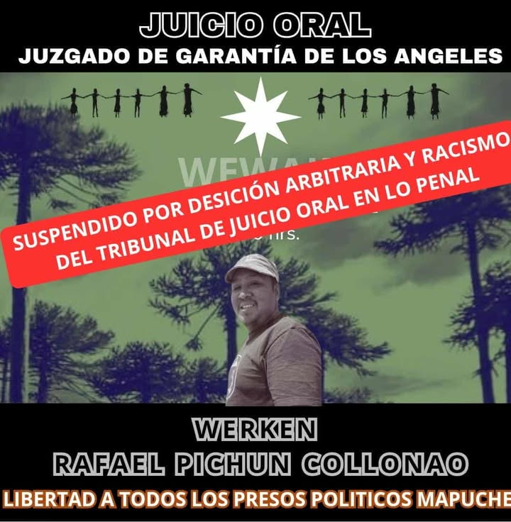 «A pocos días del juicio que estaba agendado para el día martes 14 de octubre en el tribunal de juicio oral en lo penal de los Ángeles, nos informan que ha sido arbitraria e ilegalmente suspendido; aplazándolo 4 meses más. Lo que resulta una nefasta señal de racismo institucional y una estrategia de desgaste moral hacia los ppm CAM, ya que no es un caso aislado. Esto es parte de una seguidilla de inoperancias, ilegalidades e irregularidades con el werken Rafael Pichún y con pu weichafe, voceros y dirigentes políticos del mundo mapuche. Al parecer una nueva lógica de funcionamiento del sistema judicial que NO ES NEUTRAL, NI MENOS JUSTO y busca encubrir la tortura y el desgaste hacia los comuneros con excusas que demuestran un aparato de justicia inoperante y racista.