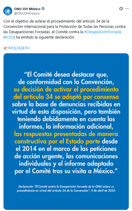 Ya en abril de 2025 el Comité había activado en México el artículo 34 de la Convención Internacional para la Protección de todas las Personas contra las Desapariciones Forzadas. Y tras recabar información buscará indicios fundados de que se trata de una situación generalizada y sistemática.