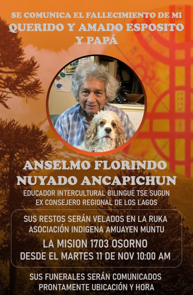 A sus 67 años de edad, Anselmo Florindo Nuyado Ancapichun, partió al Wenumapu el día de ayer, dejando un importante legado en la revitalización del Tse Sungün en la Fütawillimapu.