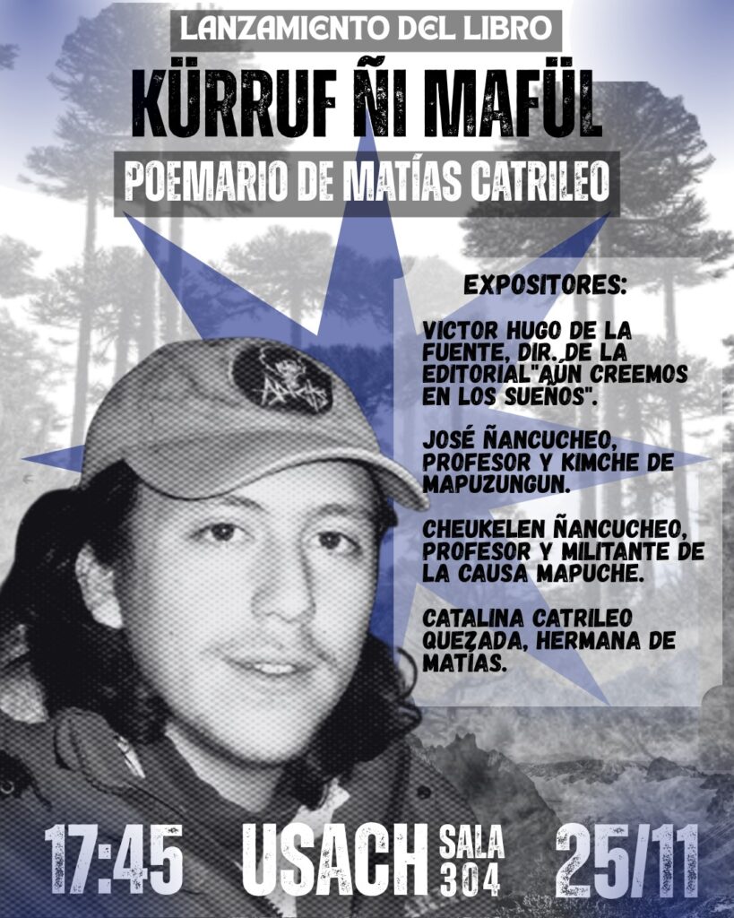 El día martes 25 de noviembre de 2025, a las 17:45 horas, en la Sala 304 de la Universidad de Santiago, USACH (O’Higgins N° 3363), se realizará el lanzamiento del libro “Kürruf ñi Mafül”, poemario de Matías Catrileo.
