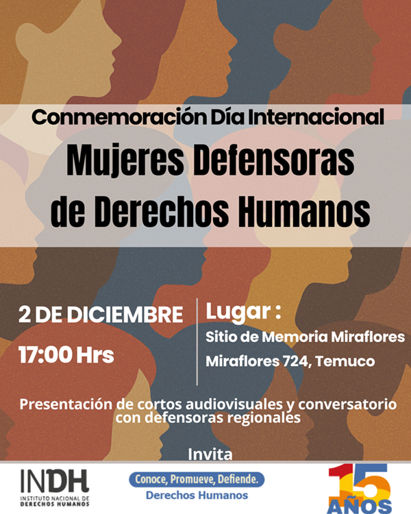 El instituto Nacional de Derechos Humanos, invita a la actividad de conmemoración del Día Internacional de las mujeres Defensoras de Derechos Humanos , que se desarrollará el día martes 2 de diciembre a partir de las 17:00 horas en el Sitio de Memoria Miraflores 724, Ex Cuartel CNI, Temuco.