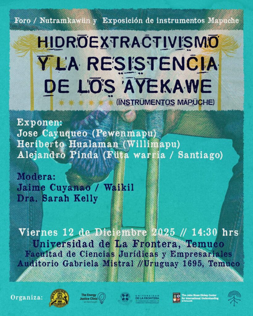 Este viernes 12 de diciembre, a las 14:30 horas, en el Auditorio Gabriela Mistral de la Facultad de Ciencias Jurídicas y Empresariales de la Universidad de La Frontera (Uruguay 1695, Temuco), se realizará el foro: “Hidroextractivismo y la resistencia de los ayekawe”. La instancia invita a mirar el territorio desde su pulso más íntimo: la sonoridad de los instrumentos mapuche, que desde tiempos antiguos sostienen la espiritualidad, memoria y la cultura colectiva del pueblo mapuche.