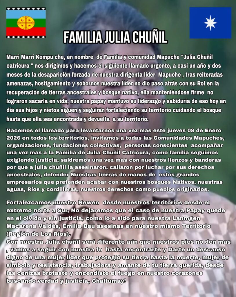 Hacemos el llamado para levantarnos una vez mas este jueves 08 de Enero 2026 en todos los territorios, invitamos a todas las Comunidades Mapuches, organizaciones, fundaciones colectivas, personas conscientes acompañar una vez mas a la Familia de Julia Chuñil Catricura, como familia seguimos exigiendo justicia, saldremos una vez mas con nuestros lienzos y banderas por que a Julia Chuñil la asesinaron, callaron por luchar por sus derechos ancestrales, defender Nuestras tierras de manos de estos grandes empresarios que pretenden acabar con nuestros bosques Nativos, nuestras aguas, Ríos y cordilleras, nuestros derechos como pueblos originarios.