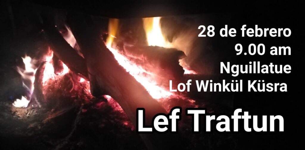 Es por lo anterior que desde el Lof convocaron a un Lef traftun a realizarse en el Nguillatuwe del lof el sábado 28 de febrero. Así, señalan: «Se convoca a las autoridades Mapuche Williche, Apu ülmen, pu lonko, pu machi, pu nguillatujo, pu aukafo, pu kona, ka monkü che a un Lef Traftun a realizarse este 28 de febrero a las 9.00 am en nuestro Nguillatue. Con el objetivo de enfrentar las amenazas a nuestro Mapunche mongen. Se solicita traer su aporte para compartir alimentos y para el efkütun».