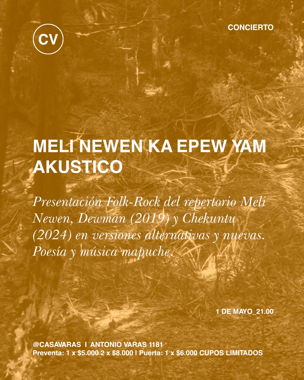 El próximo Viernes 1 de mayo de 2026, el cantante y compositor mapuche Meli Newen se presentará en Casa Varas con un concierto especial que recorrerá todo su repertorio musical. El artista ofrecerá versiones acústicas y alternativas de sus canciones, invitando al público a redescubrir la fuerza y la sensibilidad de su propuesta artística.