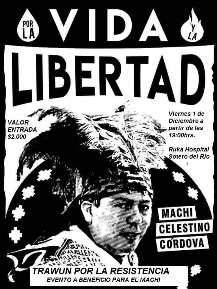 La organización invita: «Mari mari com pu che, invitamos a todes quienes sientan el llamado y quieran participar en una actividad en apoyo al Machi Celestino Cordova y su familia. Si bien sabemos que es un tema polémico, creemos que es necesario repensar nuestros juicios y posicionamientos, cuestionándonos si realmente vamos a seguir creyendo lo que dicen «las autoridades», los juzgados y la prensa. Nuestra posición es: el Machi esta preso porque es Machi y por ser mapuche, porque si la JUSTICIA CHILENA realmente existiera, la mitad de los pacos estarían presos. Estas ultimas semanas pu werken del Machi han estado repartiendo el mensaje y las peticiones que se van a levantar prontamente, para lo que se pide difusión y apañe. Estas son: Un permiso de 48 horas para ir a la renovación en su rewe. La revisión de su juicio y la sentencia, ya que es considerado injusto».