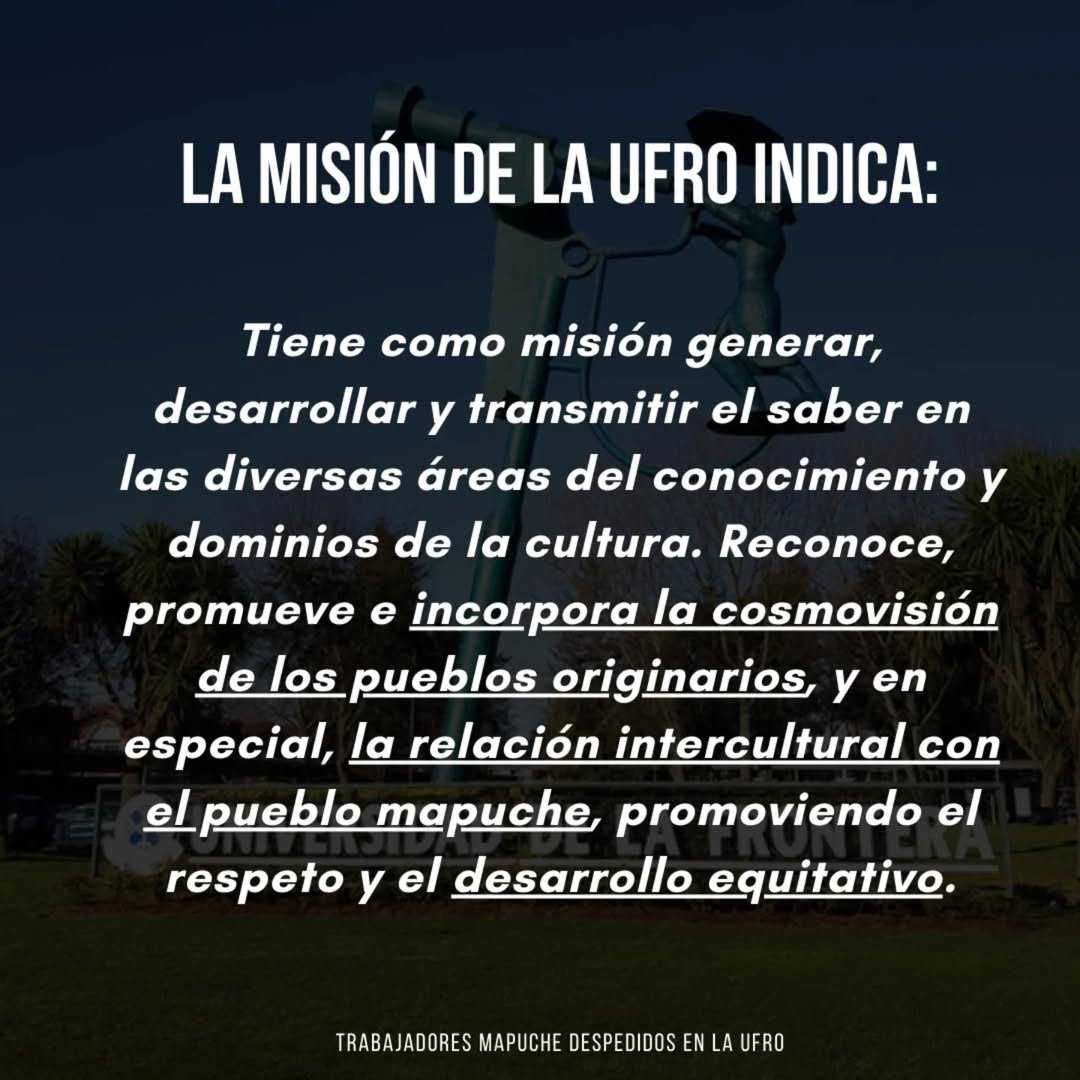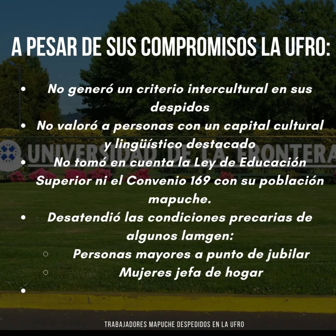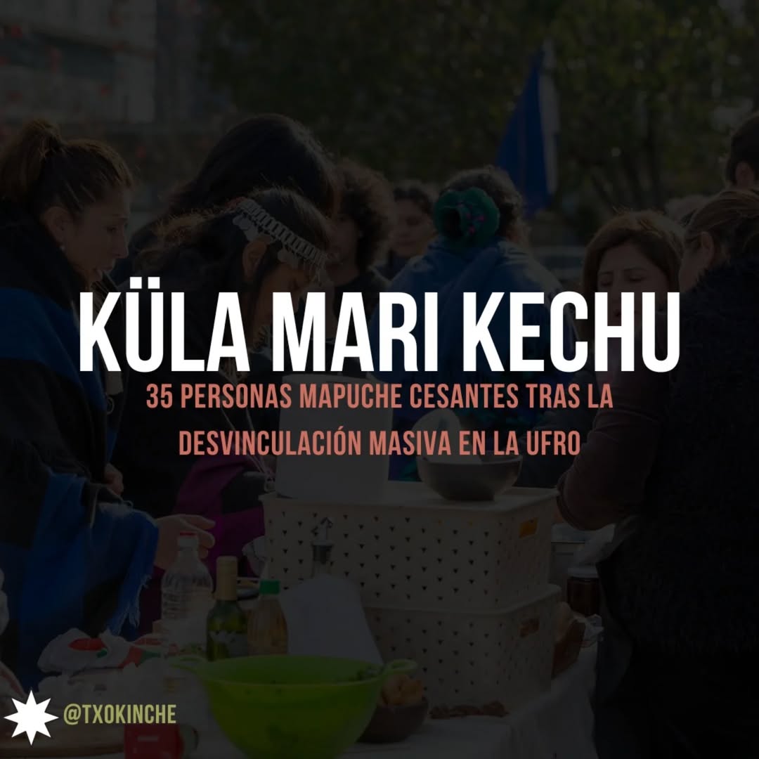 La Agrupación Troxinche, destacó: «Con tristeza compartimos con ustedes los datos al respecto de nuestros pu lamgen que han quedado sin kuzaw producto de la crisis de la Universidad de La Frontera. 35 personas entre pu zomo y pu wentxu han sido afectadas, siendo las ñaña en un porcentaje más alto las desvinculadas, así también pu chachay, gente mayor de 60 años que fueron despojados de su puesto de trabajo».